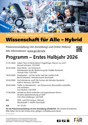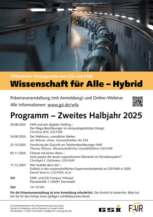 "Wissenschaft für Alle" ist eine von FAIR und GSI veranstaltete öffentliche Vortragsreihe und richtet sich an alle an aktueller Wissenschaft und Forschung interessierten Personen.