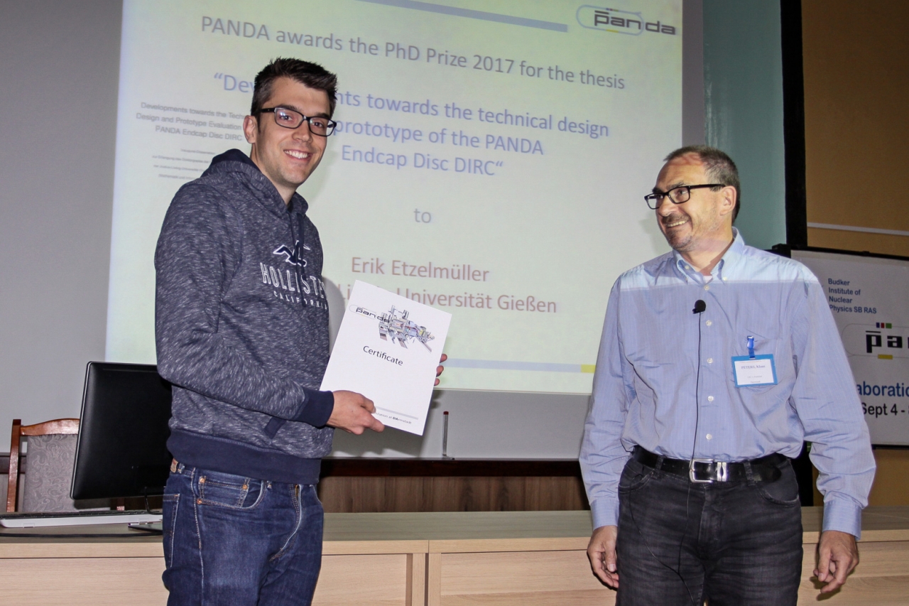 Dr. Erik Etzelmüller (left) has received the Panda PhD Prize 2017 for his doctoral thesis at GSI, FAIR, and the Justus Liebig University in Giessen. The award was presented by the spokesman of the Panda Collaboration, Klaus Peters from GSI, at the most recent Panda Collaboration meeting at the BINP in Novosibirsk.