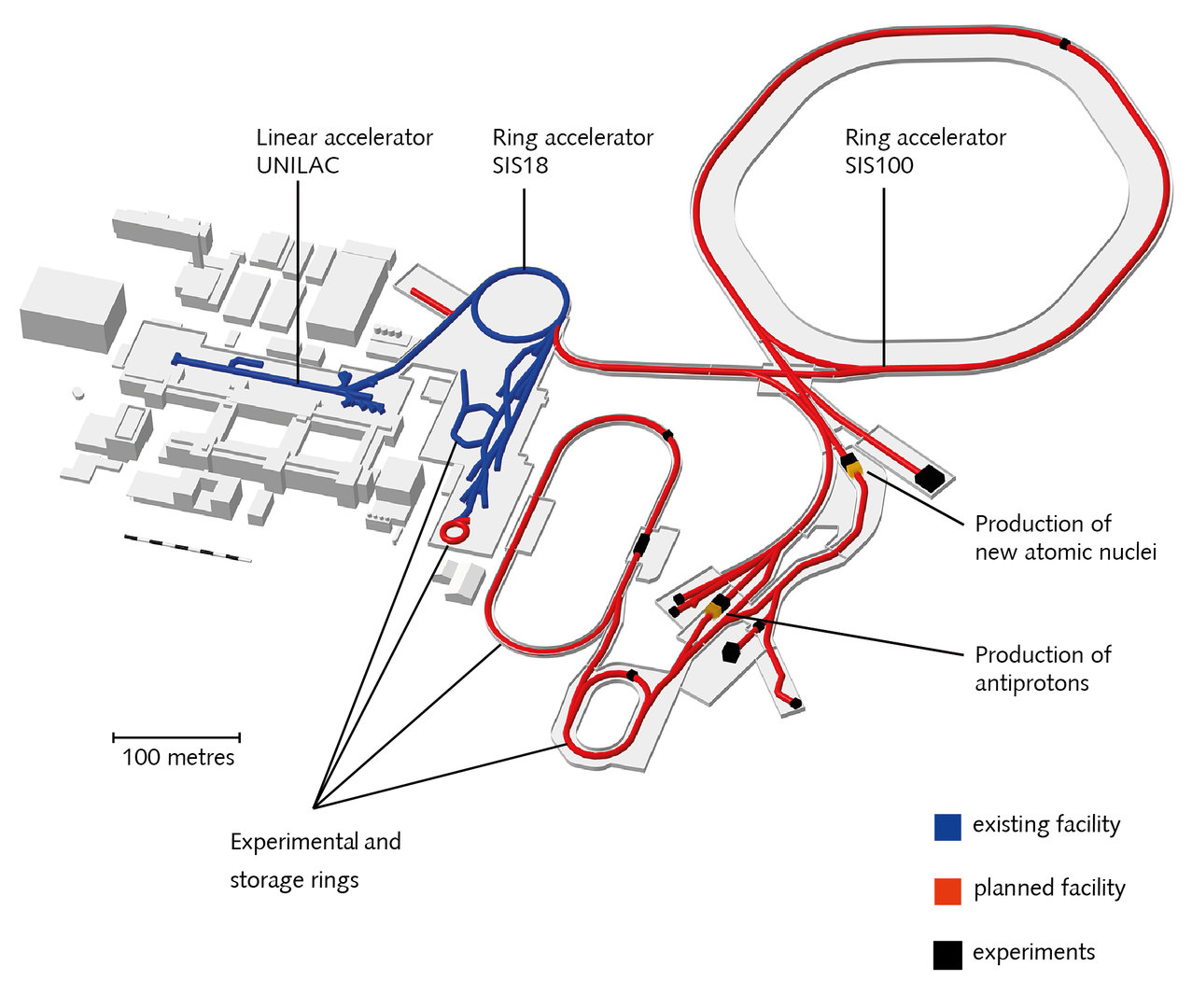 The existing GSI accelerators will serve as the first acceleration stage. The linear accelerator UNILAC, which is 120 meters long, accelerates particles to speeds as high as 20% of the speed of light. The SIS18 ring accelerator, which has a circumference of 216 meters, accelerates particles to speeds as high as 90% of the speed of light. The ions can then be shot from the SIS18 into the SIS100 ring accelerator.