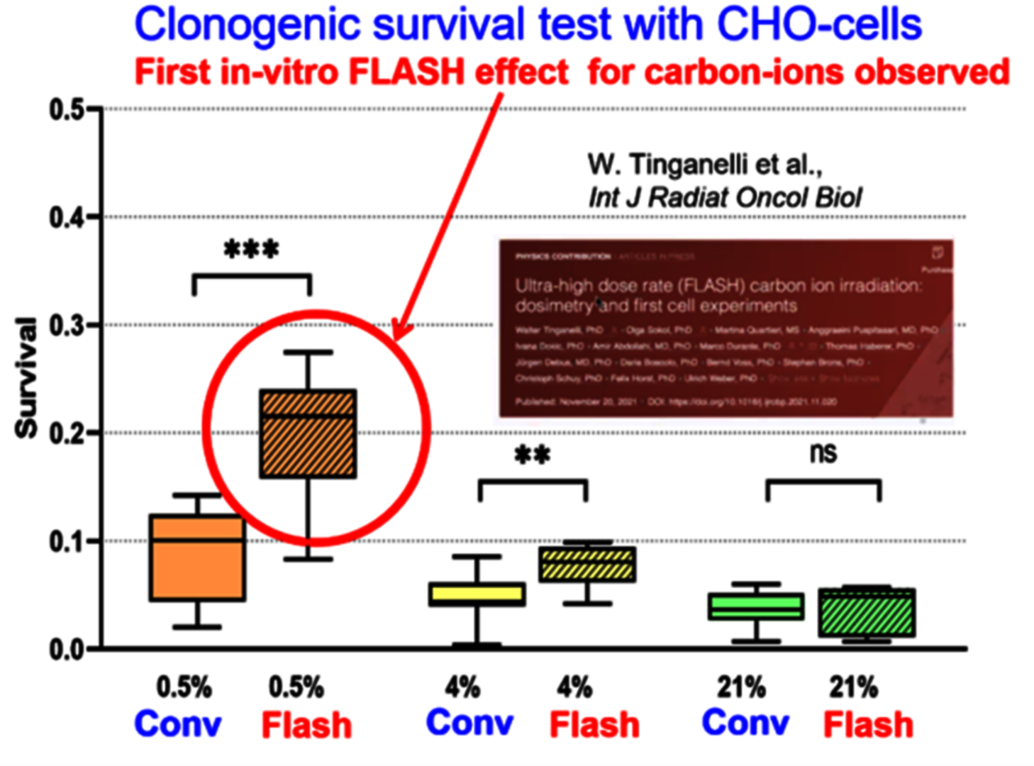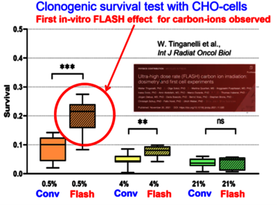 Figure 1: Cell experiment for Carbon-Ion FLASH showing higher cell survival at UHDR intensity.