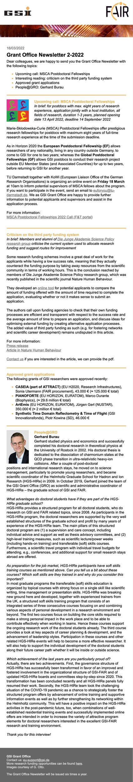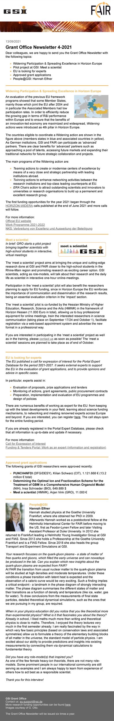 The GSI Grant Office newsletter will be issued up to six times a year. The following topics were discussed in the Newsletter 4-2025: