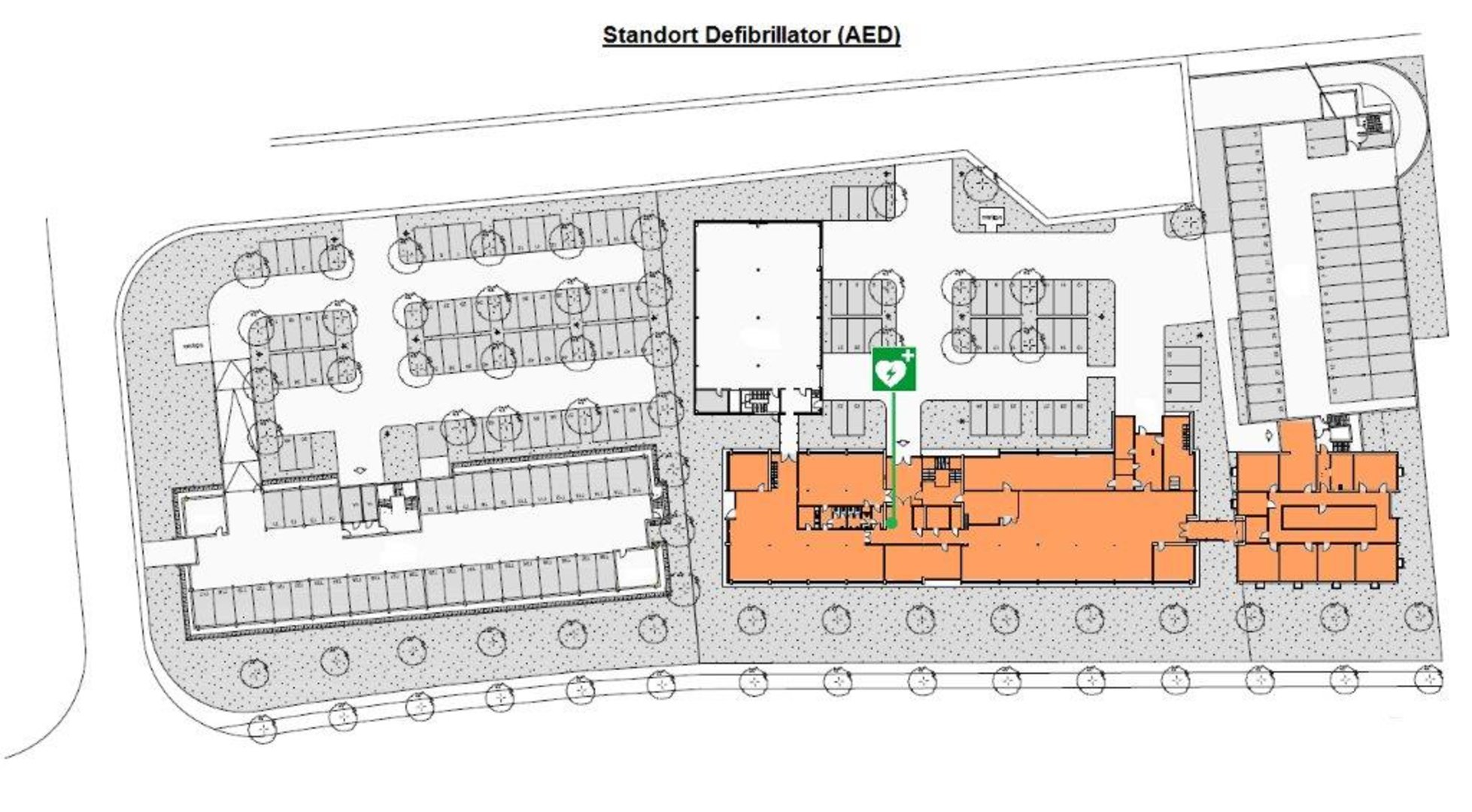 • Der AED befindet sich in der Borsigstraße 11 auf der Ebene 1, gegenüber vom Büro BS11 1.107.