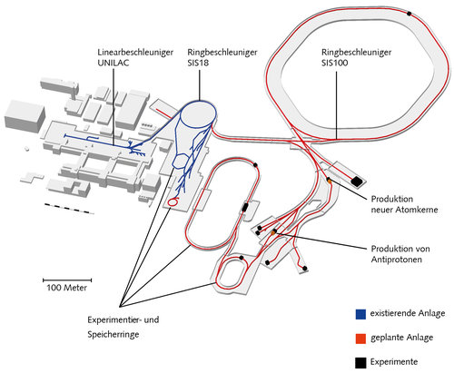 Der Ringbeschleuniger SIS100 verläuft in einem unterirdischen Tunnel, dessen Sohle bis zu 17 Meter unter der Erde liegt. Der SIS100 hat einen Umfang von 1100 Metern und kann Ionen aller natürlichen Elemente des Periodensystems bis auf 99% der Lichtgeschwindigkeit beschleunigen. Die Magnete, die die Ionen auf ihrer Bahn halten, sind supraleitend und werden mit flüssigem Helium auf -269°C gekühlt. Die beschleunigten Teilchen werden entweder direkt für Experimente genutzt oder zur Produktion von anderen Teilchen, so genannten sekundären Teilchen.