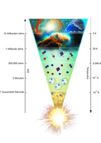 Am Anfang werden aus reinen Strahlungsfeldern zunächst masselose, dann massive Elementarteilchen. Aus einer Ursuppe bestehend aus Quarks, Gluonen, Photonen und Leptonen formieren sich eine tausendstel Sekunde nach dem Urknall die Bausteine der Atomkerne - Neutronen und Protonen - und daraus in den ersten drei Minuten die leichtesten Atomkerne. Nach 300 000 Jahren entstehen die ersten neutralen Atome. Diese bilden riesige Gaswolken, aus denen etwa eine Milliarde Jahre nach dem Urknall die ersten Sterne geboren werden. Im Inneren der Sterne entstehen über Fusion von Atomkernen die chemischen Elemente bis zum Eisen. Die schwersten Elemente werden in gewaltigen Sternexplosionen gebildet, auch heute noch - 15 Milliarden Jahre nach dem Urknall - und in ferner Zukunft.