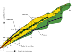 Die Kerne, die schwerer als Eisen sind, entstehen am Ende der Ära großer Sterne in so genannten Roten Riesen und in gewaltigen Supernova-Explosionen. Allen dabei auftretenden Produktionspfaden ist gemeinsam, dass sie über den Umweg radioaktiver Kerne zu den stabilen schweren Kernen führen. Wir verdanken die Vielfalt der Stoffe auf der Erde - und damit auch unsere Existenz - also einer Vielzahl von radioaktiven Kernen und Kernreaktionen, die als Zwischenschritte in der Nukleosynthese durchlaufen wurden.