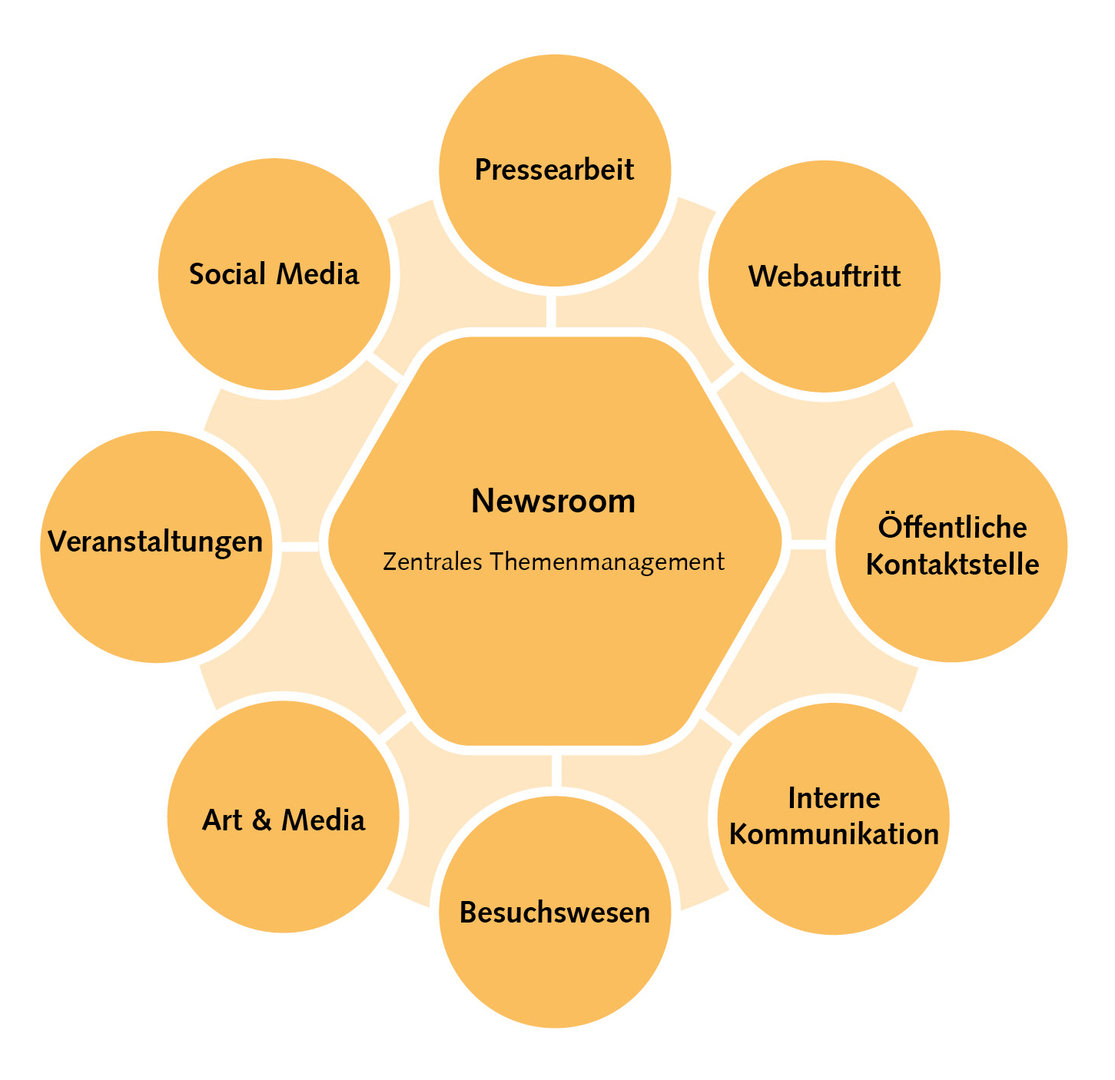 Im Newsroom findet das zentrale Themenmanagement statt. Dort werden die Themen bewertet, ausgewählt und entschieden, wie sie über welche Kommunikationsinstrumente crossmedial bearbeitet und effizient und zielgruppengerecht kommuniziert werden.