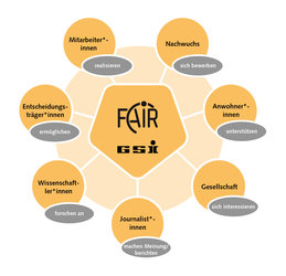 GSI und FAIR interagieren in der Kommunikation mit unterschiedlichen Stakeholdern bzw. Zielgruppen. Sie haben unterschiedliche Erwartungen und Bedürfnisse. Diese werden durch die Presse- und Öffentlichkeitsarbeit mit der Wahl der zu kommunizierenden Inhalte, der Art und Weise der Kommunikation sowie der Kommunikationswege und -instrumente bestmöglich zielgruppenspezifisch berücksichtigt.
