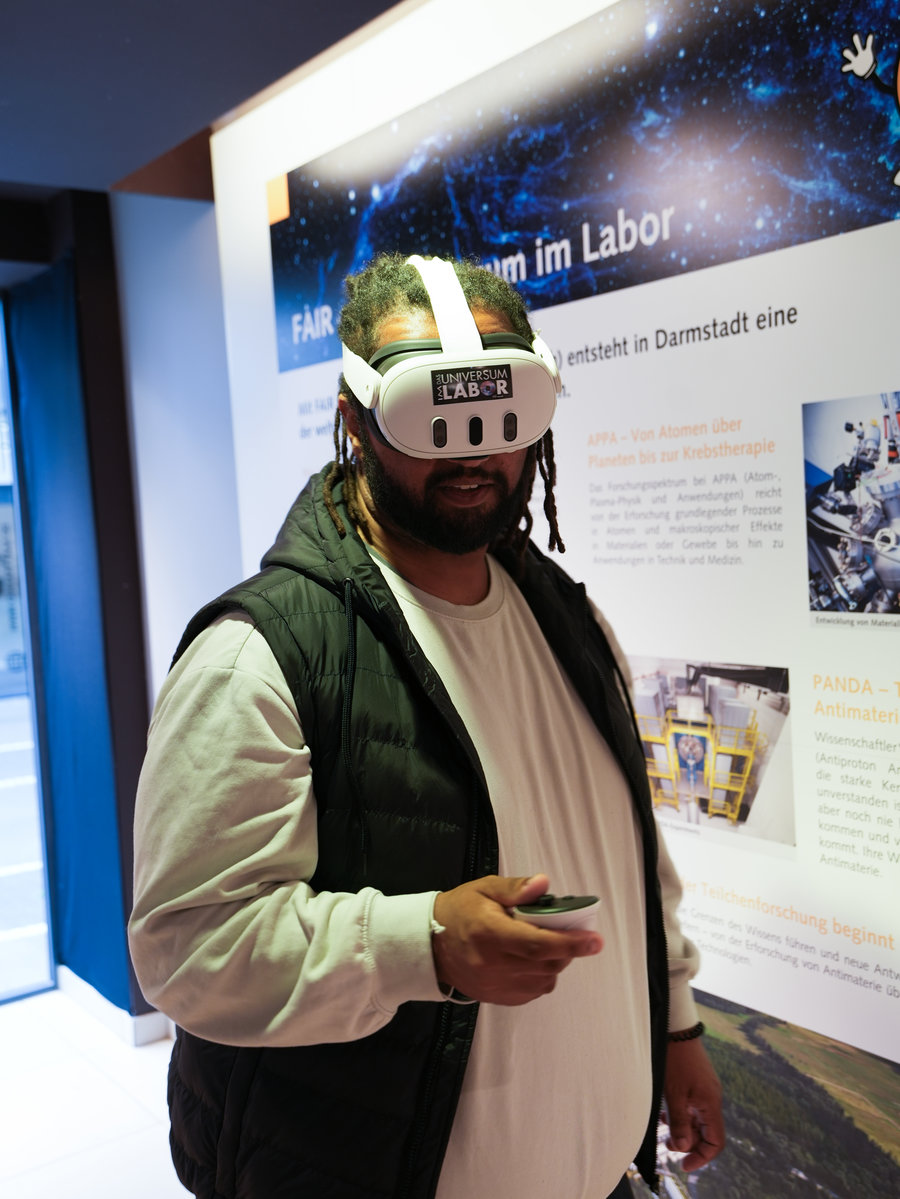 Die Abgeordneten erhielten bei einer kurzen Führung Einblicke in die Inhalte und Ziele der interaktiven Ausstellung sowie in das breite Bildungsangebot, insbesondere das Schullabor, das junge Menschen für Naturwissenschaften begeistern soll. Im Anschluss konnten die Abgeordneten an den interaktiven Stationen selbst nachvollziehen, wie Teilchen beschleunigt, erzeugt und beobachtet werden– und mithilfe von Virtual Reality Brillen unternahmen sie sogar einen kurzen Rundgang über den GSI/FAIR-Campus. (AB/MK)