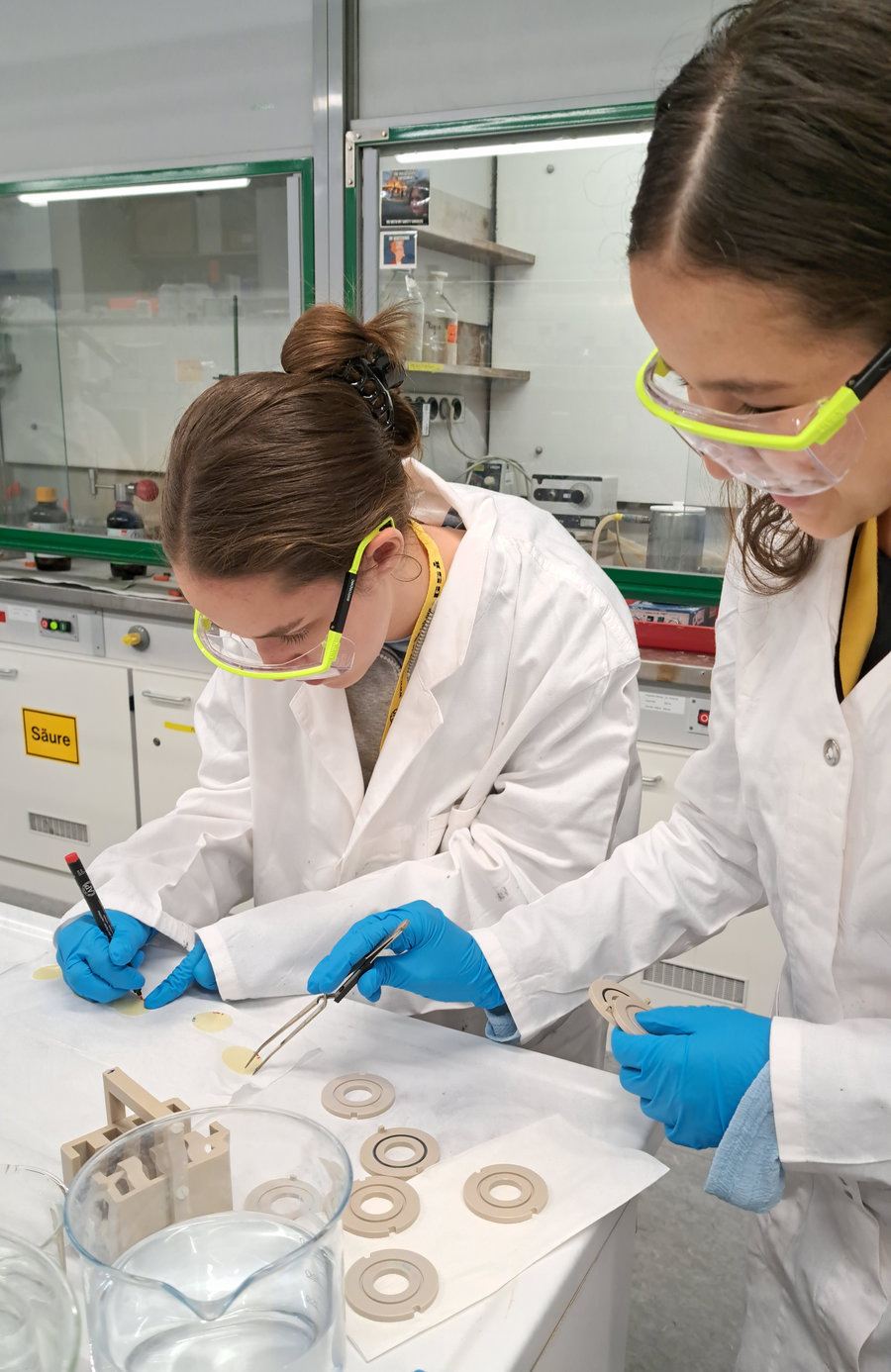 Danach ging es in Kleingruppen weiter, in denen die Mädchen mehr über die einzelnen Berufe und Arbeitsfelder auf dem Campus erfuhren. Dazu gehörten dieses Jahr unter anderem die Forschungsarbeit in Materialforschung, Atomphysik und Biophysik sowie verschiedene Berufe in den Fach- und Infrastrukturabteilungen wie Ionenquellen, Strahldiagnose, Elektronik, Engineering, Werkstätten, Targetlabor, Kryogenik, Vakuum, Technologietransfer und IT. In einem speziellen FAIR-Bauangebot konnten einige der Mädchen auch einen Einblick in die Bautätigkeit auf der Großbaustelle gewinnen.