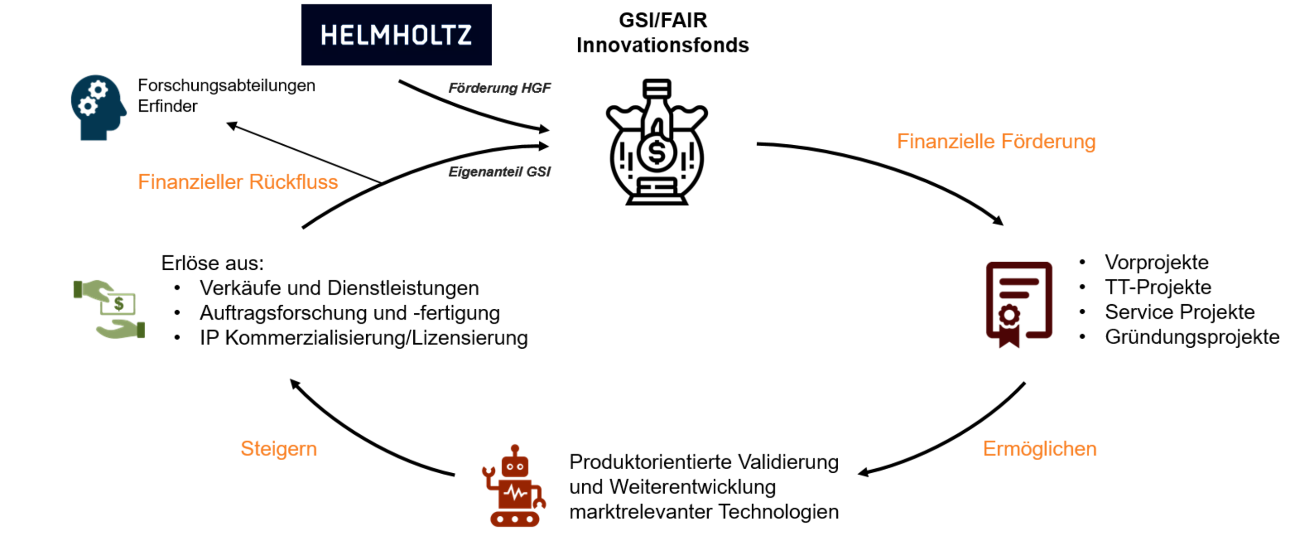 Forschungsergebnisse sowie technische Lösungen bei GSI und FAIR sind in der Regel nicht marktfähig und benötigen für Weiterentwicklungen der Technologie, des Verfahrens und/oder Software zu einem Produkt weitere Finanzmittel. Diese Weiterentwicklung erfolgt in sogenannten Technologietransfer-Projekten, welche im Idealfall gemeinsam mit einem Industriepartner durchgeführt werden. Der hier entstehende interne Finanzierungsbedarf wird abhängig von dem Projektrahmen über öffentliche Validierungsförderung oder über Mittel des hauseigenen Innovationsfonds gedeckt. GSI/FAIR und der Industriepartner entwickeln dann gemeinsam die Forschungsergebnisse oder technischen Lösungen zu marktreifen Produkten oder Verfahren weiter. Anschließend wird das Produkt vom Industriepartner vermarktet. Im Fall einer erfolgreichen Vermarktung erfolgen wiederum Rückflüsse an GSI/FAIR, welche zwischen den Erfindern oder Know-how-Trägern, der Fachabteilung und dem Innovationsfonds aufgeteilt werden.
