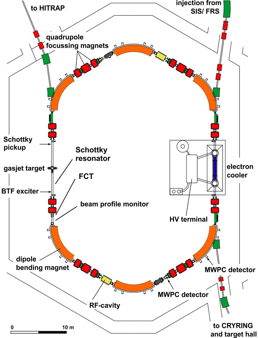 Der Experimentier-Speicherring ESR erlaubt die Speicherung geladener Teilchen mit relativistischen Geschwindigkeiten über einen weiten Bereich von Massen und Energien. Das Hauptinteresse liegt bei hochgeladenen Schwerionen und radioaktiven Strahlen, die im Fragment-Separator FRS produziert werden. Alle im ESR genutzten Ionen werden im Schwerionen-Synchrotron SIS auf die erforderlichen Energien beschleunigt und zum ESR transferiert. Wesentliches Merkmal des ESR ist die Möglichkeit, die Qualität des gespeicherten Strahls durch Phasenraumkühlung um viele Größenordnungen zu verbessern. Hierfür steht sowohl Elektronenkühlung wie auch stochastische Kühlung zur Verfügung. Für Experimente mit gespeicherten Strahlen wurde ein internes Gas-Target in eine gerade Strecke des ESR integriert. Ein weiteres Merkmal des ESR ist die Möglichkeit, die bei hohen Energien produzierten hochgeladenen Ionen- und Fragmentstrahlen auf niedrige Energien abzubremsen. Die abgebremsten Strahlen können für Experimente im Speicherring genutzt werden oder aus dem Speicherring extrahiert werden. Dafür steht ein langsames Extraktionsverfahren für Experimente an externen Targets zur Verfügung oder eine schnelle Extraktion, mit der die niederenergetischen Ionen zur weiteren Abbremsung zum CRYRING oder dem HITRAP-Linearbeschleuniger weitergeleitet werden können. Die Speicherung hochgeladener Ionen, insbesondere bei niedrigen Energien erfordert ein ausgezeichnetes Vakuum, weshalb der ESR mit einem UHV-System ausgestattet ist, das einen Druck im Bereich von 10-11 mbar erlaubt.