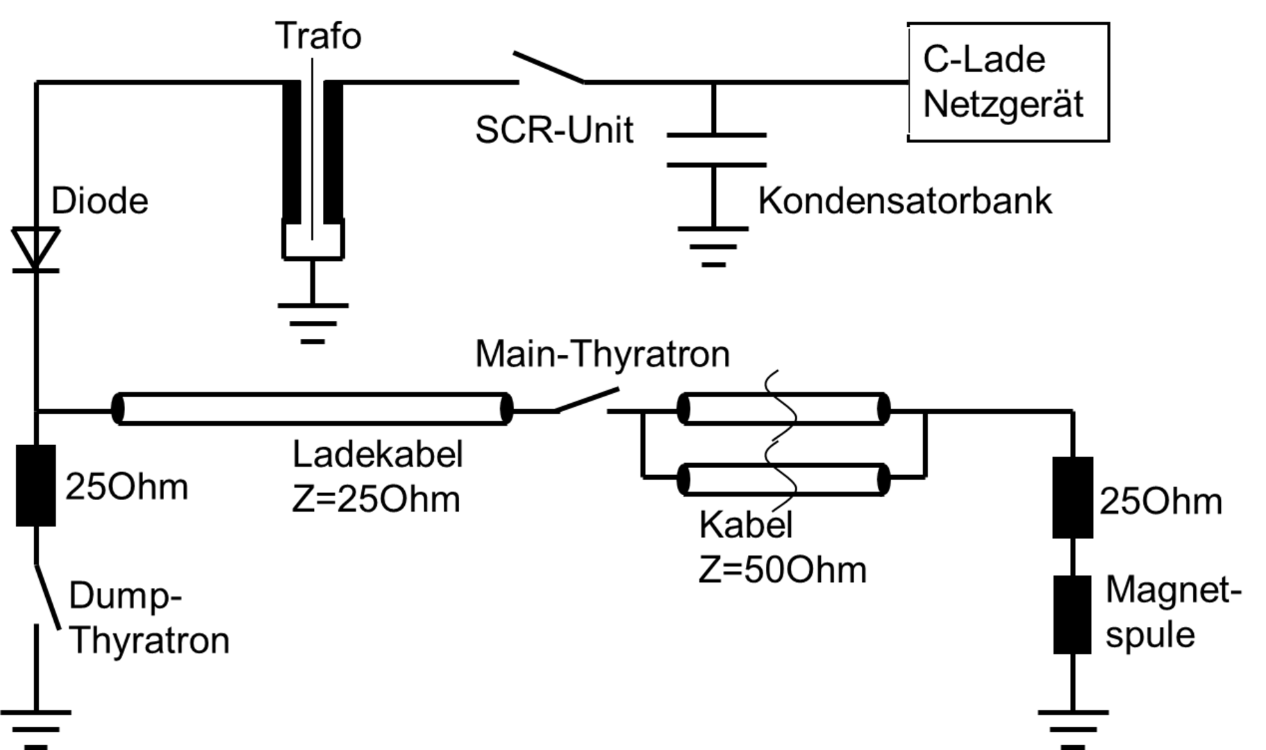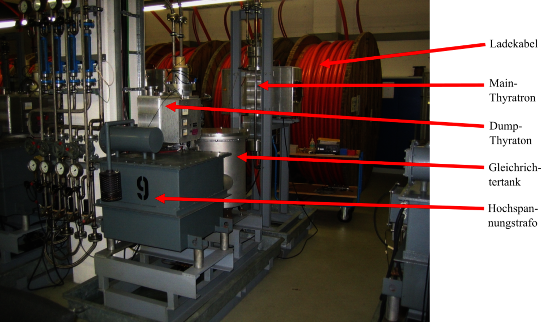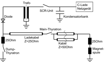 Der reale Aufbau dieser Schaltung hat einen größeren Platzbedarf. Bei der genutzten Hochspannung ist eine Isolation mittels Öl notwendig. Dieses wird auch zur Kühlung der Thyratrons verwendet. Im Gleichrichtertank ist neben den Dioden auch noch ein Messteiler für die Diagnose untergebracht. Die Kabeltrommeln im Hintergrund des Bildes, auf welchen das rote Ladekabel aufgerollt zu sehen ist, haben einen Durchmesser von ca. 2,5 m.
