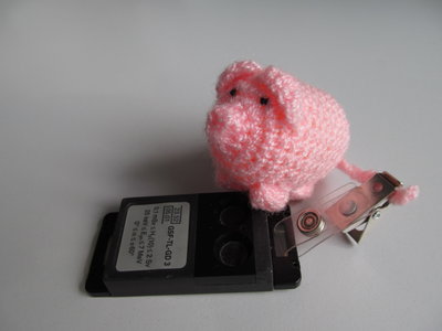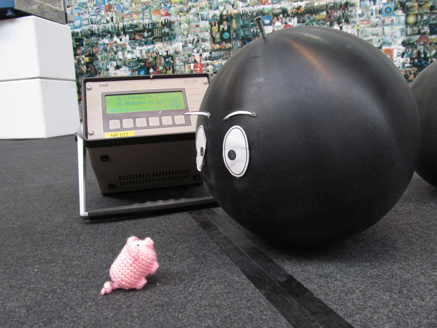 Am Ende der Unterweisung erhält das Helmholtz-Häkelschwein ein amtliches Dosimeter.