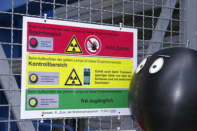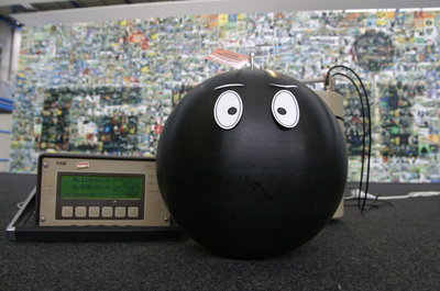 Dosie ist in der Targethalle und liest die elektronisch gemessene Dosisleistung ab.